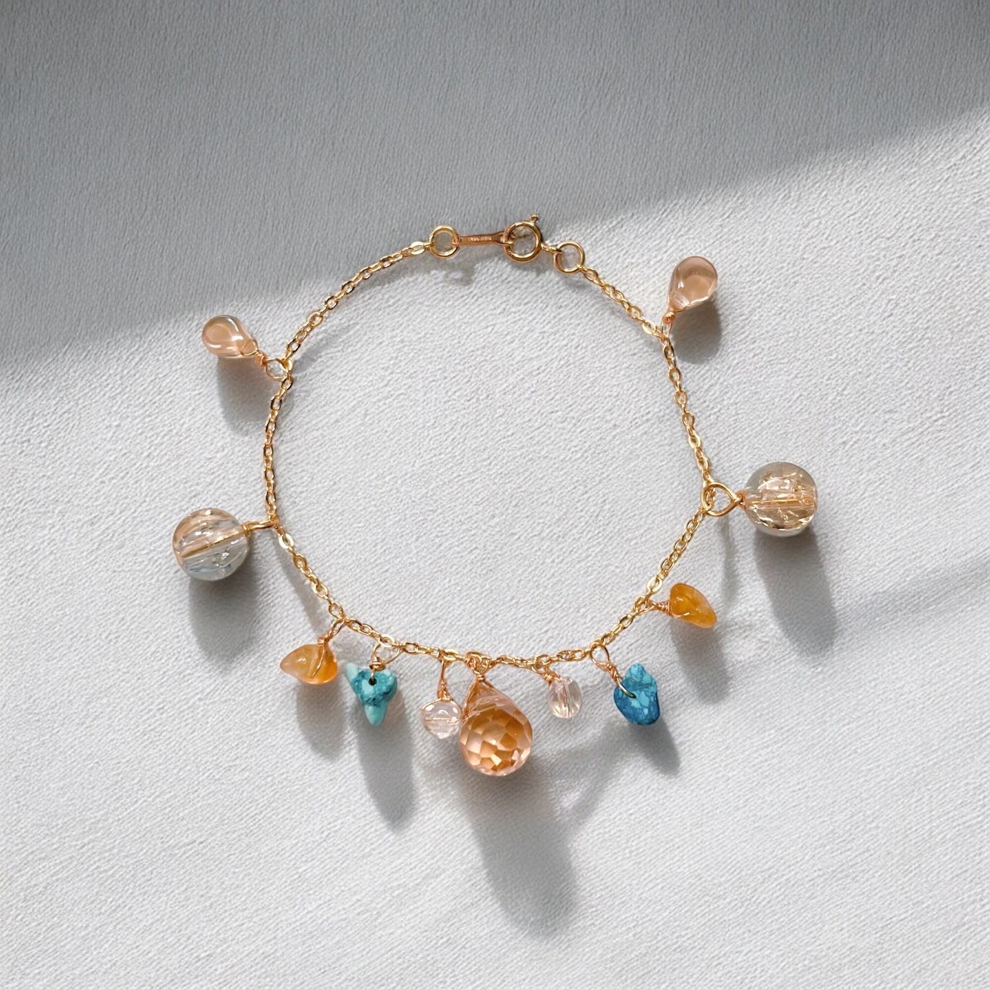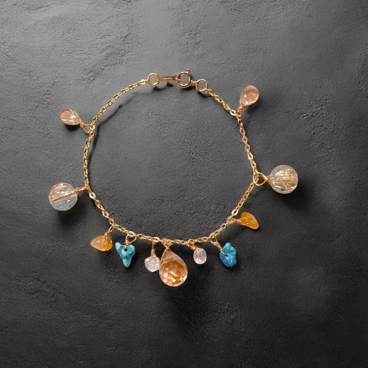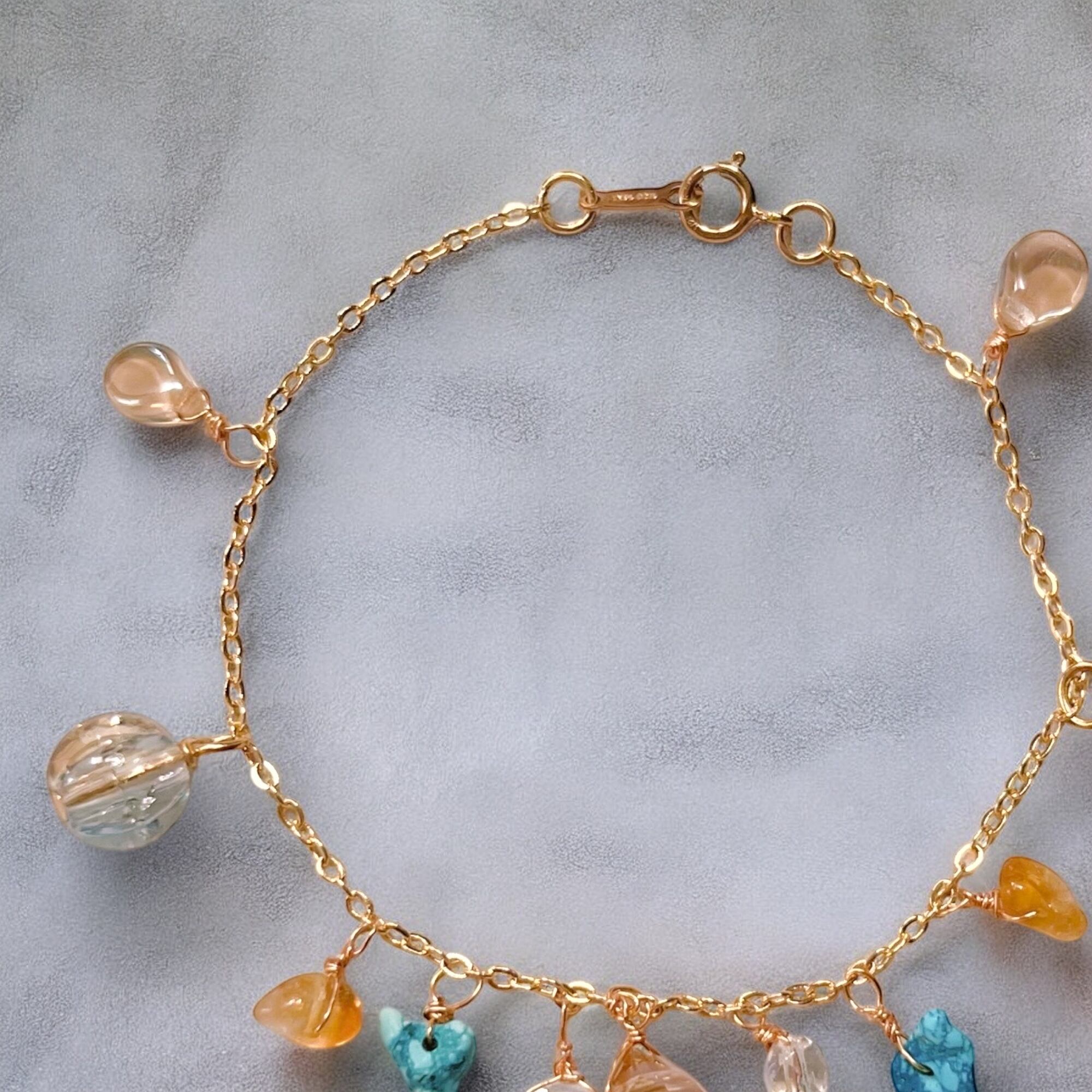 人気の高いターコイズとシトリンが印象的なブレスレット『Daydream』です。同系色のガラスやチェコビーズが上品に輝きを放ち、14kgfのチェーンとともに日焼けした肌にもマッチします。