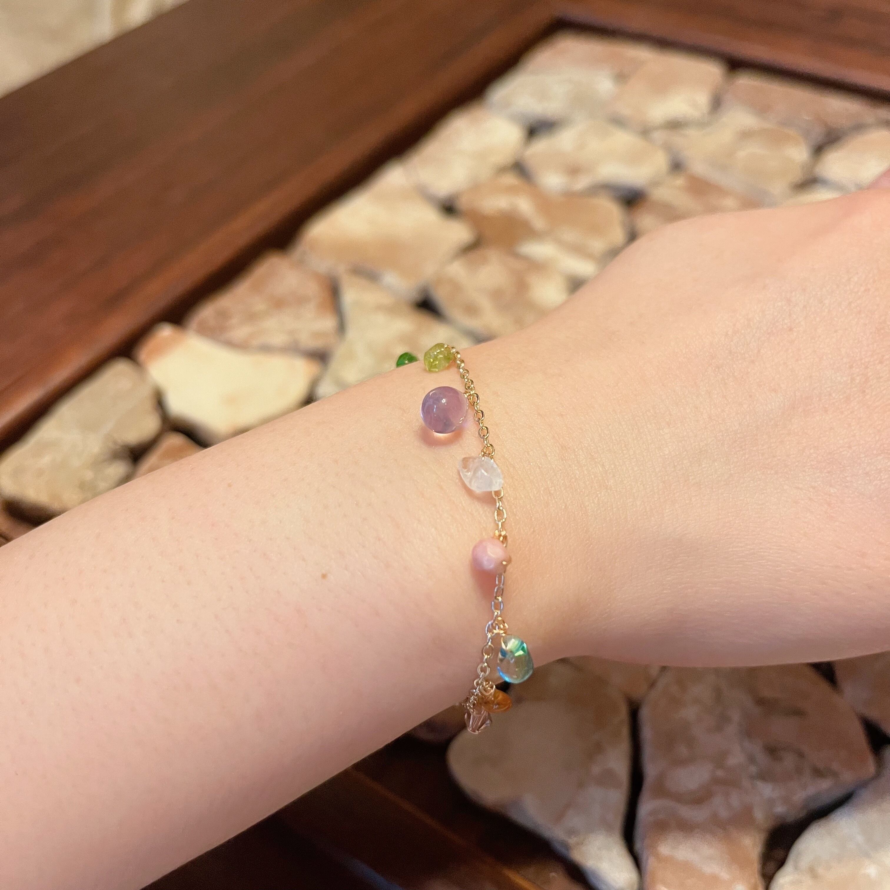 カラフルで陽気な虹色ブレスレット『Make me happy』です。色とりどりのチェコビーズと天然石が織りなす心踊るデザイン。14kgfのチェーンがしなやかに手首を包み、鮮やかな色合いが心を明るくしてくれます。